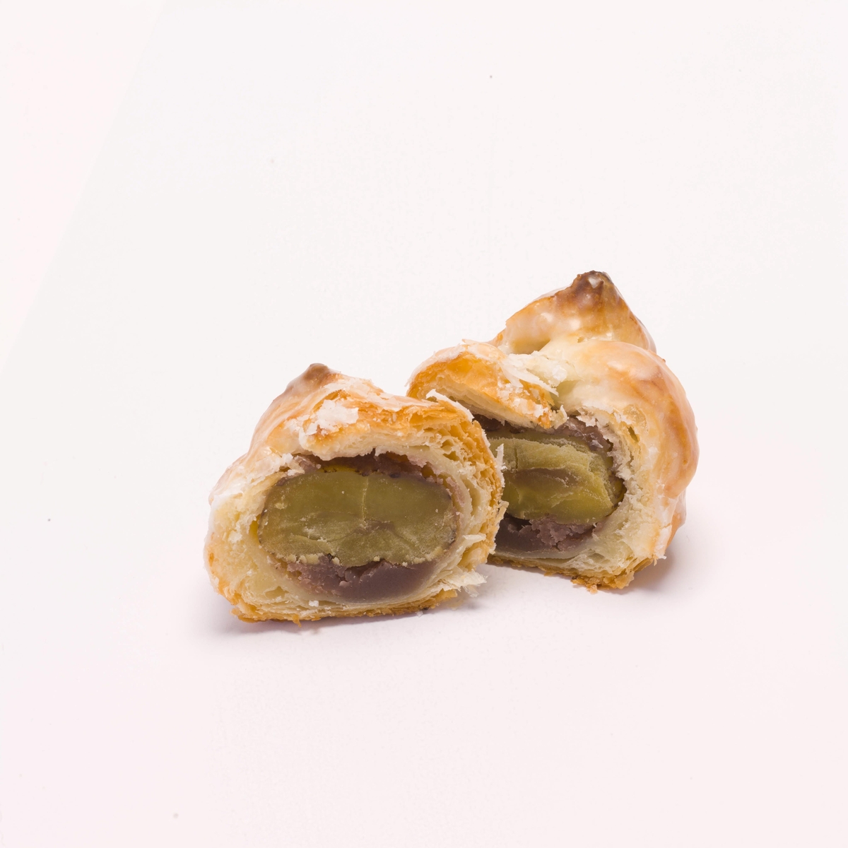 フレッシュバターを包んだ生地を折り重ねたパイ生地で当店特製の大きな和栗とこしあんを包んで焼きました。フォンダンをかけて仕上げています。